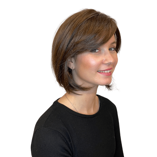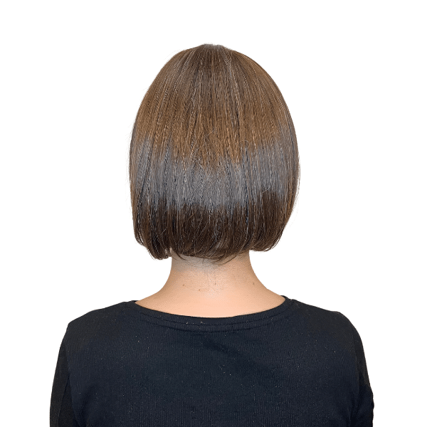 Peluca de fibra con monopart en la coronilla, para lograr mayor naturalidad.